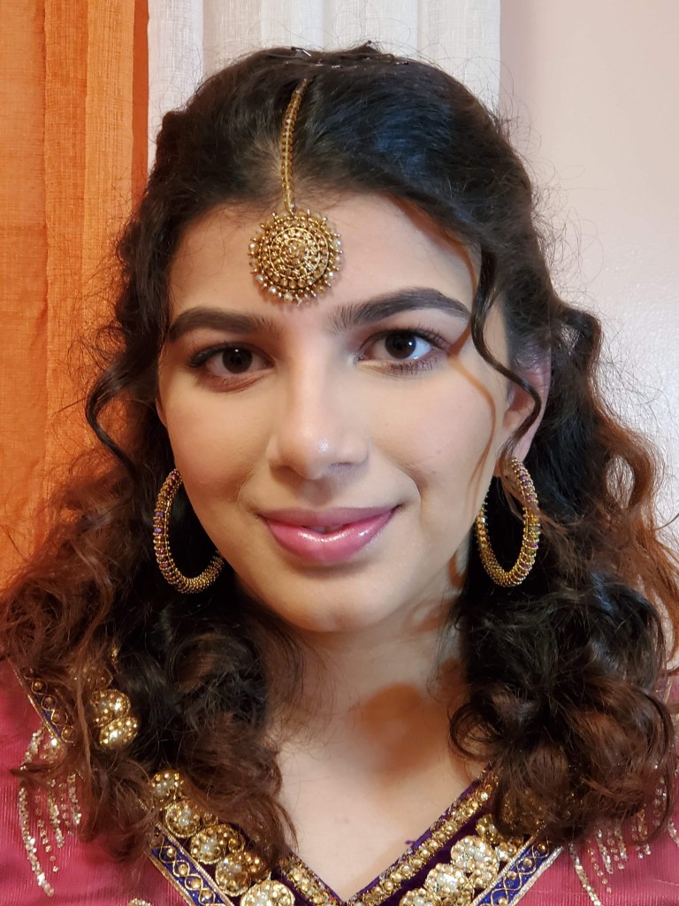 My hair, well that was an interesting thing. I was not sure how I wanted to do my hair and had tried to do an updo but it looked horrible. My aunt ended up doing my hair into a half up half down situation and it looked great! I don’t like to tease my hair or add hairspray because it damages my hair so easily and Hairspray irritates my skin. However, I had to do it in order to set the dupatta and secure it.The dupatta pinning was a bit tricky. I had never pinned my own dupatta before but I got the hang of it!